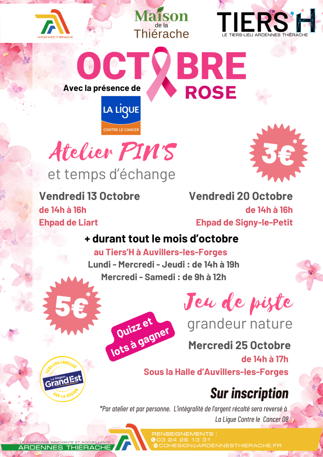 Octobre Rose est un mois dédié à la sensibilisation et à la lutte contre le cancer du sein. Chaque année, de nombreuses initiatives voient le jour pour soutenir cette noble cause. En octobre 2023, la Maison de la Thiérache et Tiers’H, le tiers-lieu porté par Ardennes Thiérache, s’associent pour vous proposer des activités passionnantes tout en contribuant à la lutte contre le cancer du sein.