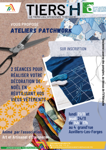 Homepage Agenda Atelier Patchwork Share Atelier Patchwork Tiers'H Thursday 24 November 2022 From 14:00 to 17:15 Tiers-H tiers-lieu 4 grand rue 08260 Auvillers-les-Forges Contact Itinerary