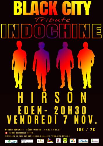Homepage Agenda Black City Tribute Indochine Share Black City Tribute Indochine Hirson Salle de l'Eden - Hirson Friday 07 November 2025 From 20:30 to 22:30 10€/2€ Contact , 02500 Hirson Renseignements et réservations : 03 23 58 81 33 Billetterie en Ligne : mairiehirson.maplace.fr / ww.ville-hirson.fr