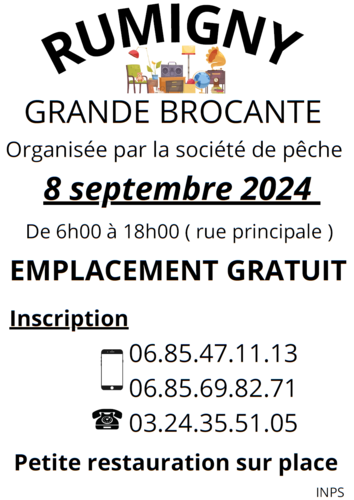 Homepage Agenda Brocante - Rumigny Share Brocante - Rumigny Rumigny Rue principale Sunday 08 September 2024 From 06:00 to 18:00 Emplacement Gratuit Petite restauration sur place Contact Société de Pêche , 08290 Rumigny 06 85 47 11 13 - 06 85 69 82 71 - 03 24 35 51 05