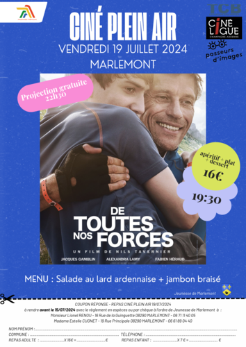 Homepage Agenda Ciné plein air Share Ciné plein air Marlemont Friday 19 July 2024 From 19:30 to 22:30 apéritif+ plat+ dessert pour 16€projection gratuite à 22 h 30 Contact ciné ligue , Itinerary