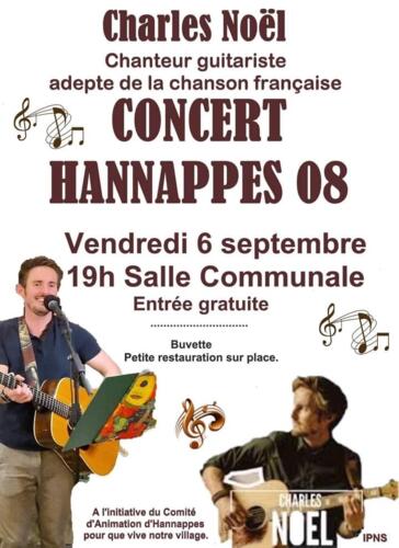 Homepage Agenda Concert CHARLES NOËL Share Concert CHARLES NOËL Hannappes Salle Communale Friday 06 September 2024 From 19:00 to 20:00 Chanteur guitariste adepte de la chanson française.Entrée gratuite.Buvette et petite restauration sur place. Contact Comité d'animation d'Hannappes , 08290 Hannappes