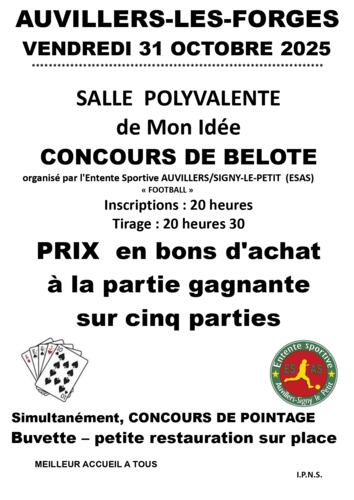 Homepage Agenda Concours de belote Share Concours de belote Mon idée - salle polyvalente Friday 31 October 2025 From 20:00 to 23:45 Contact ESAS , Itinerary