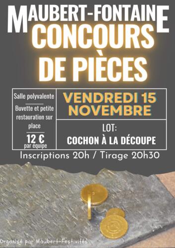 Homepage Agenda Concours de Pièces / Maubert-Fontaine Share Concours de Pièces / Maubert-Fontaine Maubert-Fontaine Salle polyvalente / Maubert-Fontaine Friday 15 November 2024 From 20:00 to 23:45 Inscriptions 20hTirage 20h30 12€ par équipe Buvette et petite restauration sur place. Contact Maubert Festivités , 08260 Maubert-Fontaine