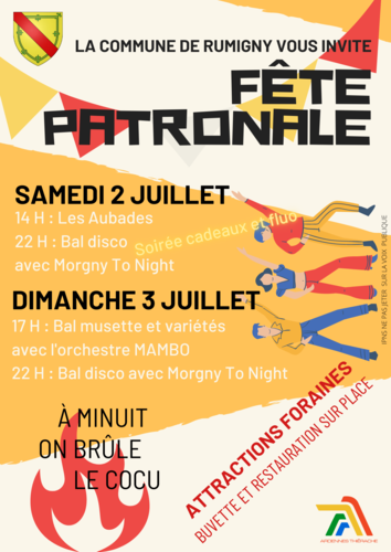 Homepage Agenda Fete patronale 2022 à Rumigny Share Fete patronale 2022 à Rumigny Rumigny Saturday 02 July 2022 From 14:00 to Sunday 03 July à 23:45 Contact Itinerary