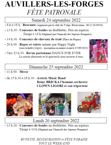 Homepage Agenda Fête Patronale Share Fête Patronale Auvillers-Les-Forges Auvillers-Les-Forges Saturday 24 September 2022 From 08:00 to 23:45 Contact 08260 Auvillers-Les-Forges Itinerary