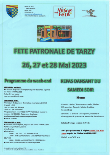 Homepage Agenda Fête Patronale de Tarzy Share Fête Patronale de Tarzy Tarzy Tarzy Friday 26 May 2023 From 19:30 to Sunday 28 May à 20:00 Contact 08380 Tarzy Itinerary
