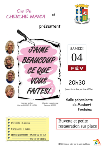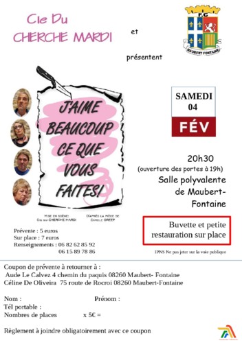 Homepage Agenda J'AIME BEAUCOUP CE QUE VOUS FAITES ! Share J'AIME BEAUCOUP CE QUE VOUS FAITES ! Maubert-Fontaine Salle Polyvalente de Maubert-Fontaine Saturday 04 February 2023 From 19:00 to 23:00 Contact 08260 Maubert-Fontaine Itinerary