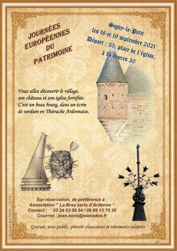 Homepage Agenda Journée Européennes du patrimoine 2021 Share Journée Européennes du patrimoine 2021 Signy-Le-Petit 35 place de l'Eglise Signy-le-Petit Saturday 18 September 2021 From 14:30 to 16:30 Déambulation à travers les rues du village, explications sur l’histoire de la cité avec guide. Contact Jean Seris 08380 Signy-Le-Petit 0689137530 jean.seris@wanadoo.fr Itinerary