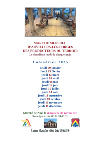 Homepage Agenda Marché de NOËL du Marché Mensuel des Producteurs du Terroir Share Marché de NOËL du Marché Mensuel des Producteurs du Terroir Auvillers-Les-Forges Halle d'Auvillers-Les-Forges Sunday 30 November 2025 From 16:00 to 20:00 Contact Les amis de la halle , 08260 Auvillers-Les-Forges 06 12 18 49 03