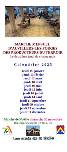 Homepage Agenda Marché Mensuel des Producteurs du Terroir Share Marché Mensuel des Producteurs du Terroir Auvillers-Les-Forges Halle d'Auvillers-Les-Forges Thursday 11 December 2025 From 16:00 to 20:00 Contact Les amis de la halle , 08260 Auvillers-Les-Forges