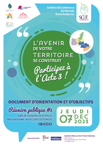 Homepage Agenda Réunion de Concertation du Public sur le Document d'Orientation et d'Objectifs (DOO) Share Réunion de Concertation du Public sur le Document d'Orientation et d'Objectifs (DOO) Halle d'Auvillers-les-Forges Thursday 07 December 2023 From 18:00 to 23:45 Contact Itinerary