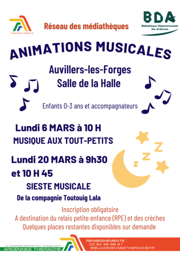 A destination de la crèche d’Auvillers-les-forges et le Relais Petite Enfance, mais places restantes disponibles, sur réservation, au 03.24.26.88.81 / bibli@ardennesthierache.fr.