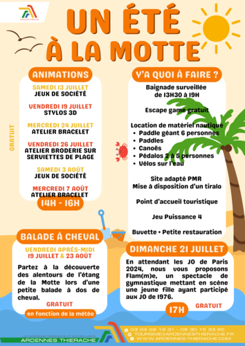 Homepage Agenda Un Été à la Motte - Atelier Bracelet Share Un Été à la Motte - Atelier Bracelet Signy-Le-Petit Étang de la Motte Wednesday 07 August 2024 From 14:00 to 16:00 Contact , 08380 Signy-Le-Petit
