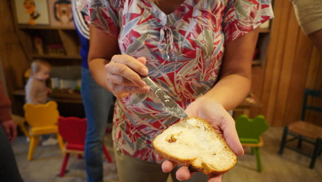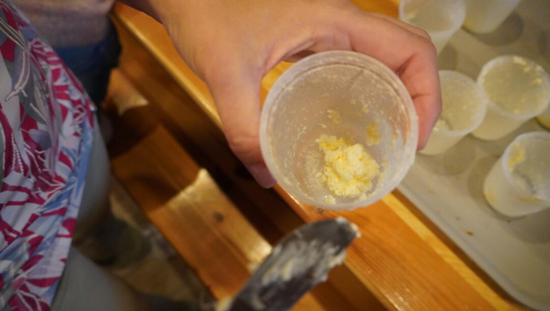 Puis Sophie a présenté aux enfants la baratte, outil indispensable pour la fabrication du beurre. Retour dans la salle du rez-de-chaussée. On verse de la crème liquide entière dans des petits gobelets et on secoue très fort. Et là, magie ! Du beurre s’est formé au fond des récipients. Sophie récolte toutes les mottes de beurre et les rince à l’eau claire, pour enlever le petit lait, avant de les déguster sur des bonnes tartines de pain, le tout accompagné de bon jus de pomme.