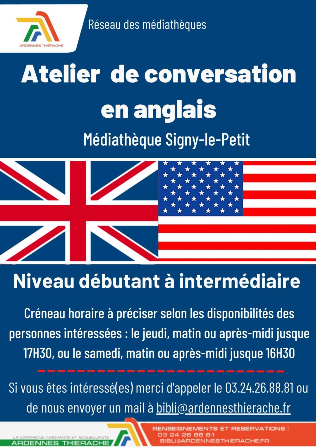 Un atelier de conversation en anglais va se mettre en place prochainement à la médiathèque de Signy-le-Petit, pour apprendre à communiquer, comprendre et se faire comprendre en anglais. Il s’agit moins de cours formels d’anglais que de séances d’échanges dans cette langue. Que ce soit dans un but professionnel, dans l’optique de partir en voyage ou simplement pour regarder vos séries préférées en V.O…
