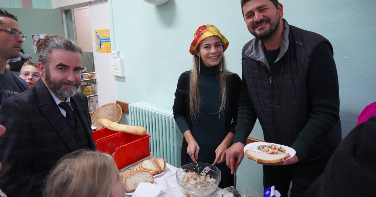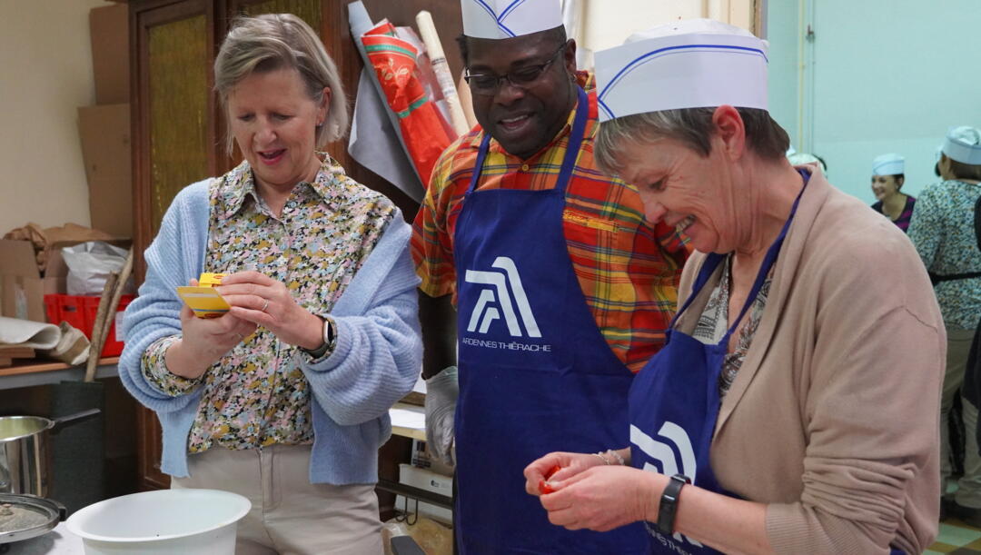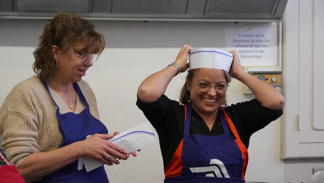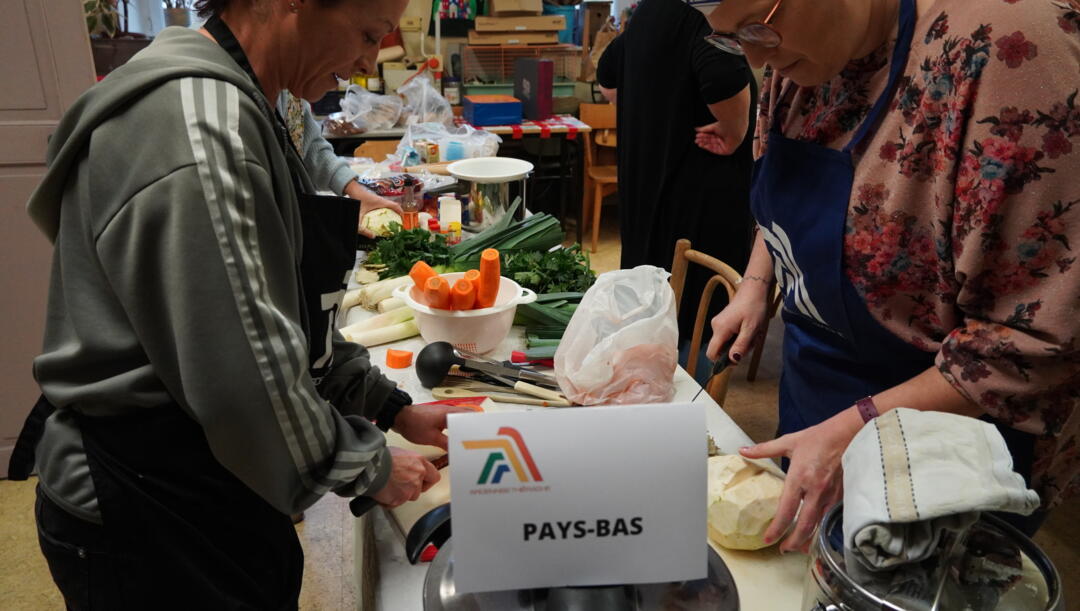 La recette est la même : 5 ateliers avec 5 cuisines différentes. Pour ce deuxième service étaient présents : la Guadeloupe avec l’Association Afro-Antillaise, Les Pays-Bas avec Marijke, les Chtis avec Karine, la Turquie avec Sule et l’Ukraine avec Polina. Les 25 participants ont profité de ce moment pour échanger en cuisinant, dans la bonne humeur. Les élèves du lycée ont encadré les enfants avec des activités coloriage et maquillage et surtout un atelier dessert : tiramisu poire caramel et madeleines !