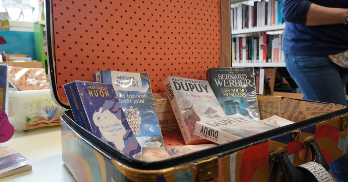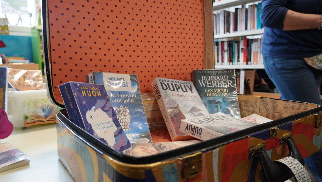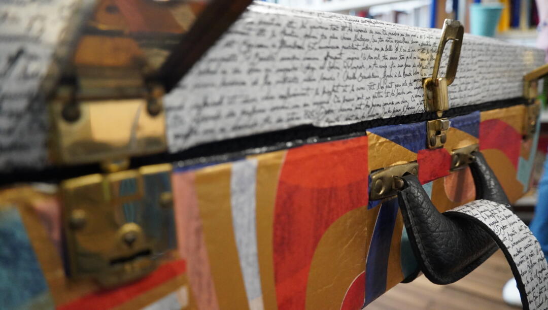 Mais comment se déplacer avec des livres ? Une vieille valise fera l’affaire ! Jocelyne la décore à l’aide de papier décopatch : « J’ai choisi un motif d’écriture pour rappeller les livres », et ajoute des roulettes : « c’est plus facile pour se déplacer, une fois remplie la valise pèse lourd ».