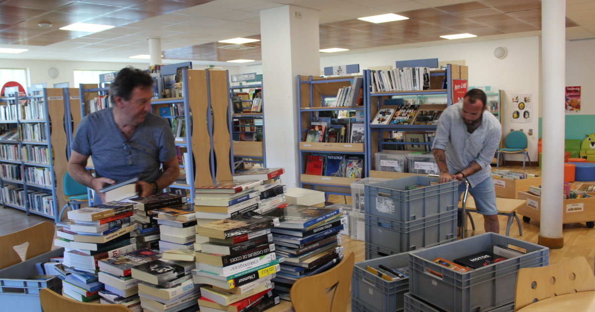 Tous les six mois environ, des agents de la bibliothèque départementale (ici Arnaud et Justin, en photo) viennent reprendre les documents par catégorie (un coup les romans adultes, un autre les albums jeunesse, un autre les BD etc…) et nous en rapportent de nouveaux, pour la plus grande joie des lecteurs qui peuvent profiter de tout nouveaux livres dans les rayons.