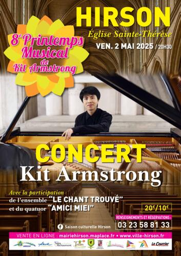 Accueil Agenda 8ème Printemps musical de Kit Armstrong à Hirson Partager : 8ème Printemps musical de Kit Armstrong à Hirson Hirson - Eglise Sainte Thérèse vendredi 02 mai 2025 à partir de 20:30 jusqu'à 22:30 . Vente en ligne : mairiehirson.maplace.fr Contact : Mairie d'Hirson - service fêtes et culture , 03 23 58 81 33 Itinéraire