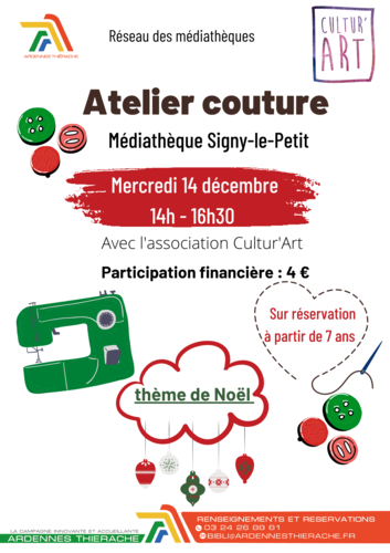 Le réseau des médiathèques Ardennes-Thiérache organise avec l’association Cultur’Art un atelier de couture spécial Noël, le mercredi 14 décembre à 14h, à la médiathèque de Signy-le-Petit.