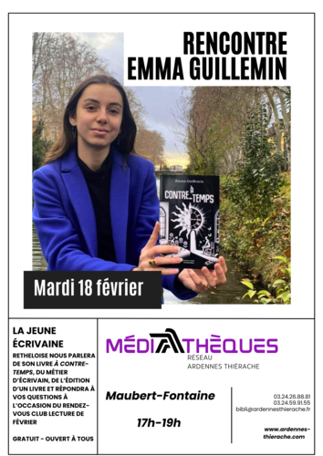 À 20 ans, Emma Guillemin, étudiante dans le domaine scientifique et originaire de Rethel, a publié son premier livre, À contre-temps (aux éditions MAÏA), dans lequel elle nous livre une réflexion sur la vie, le temps, la routine, le bonheur et la façon dont l’humain navigue entre rêve et réalité. Nous aurons le plaisir de la recevoir à l’occasion de notre club lecture mensuel, auquel tout le monde est le bienvenu. Elle nous parlera de son livre, mais aussi de l’écriture en général et de son expérience du monde de l’écriture et de l’édition.