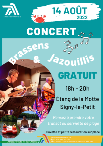 Accueil Agenda Concert Brassens et Jazouillis Partager : Concert Brassens et Jazouillis Signy le Petit Étang de la Motte Signy le Petit dimanche 14 août 2022 à partir de 18:00 jusqu'à 20:00 . Contact : 08380 Signy le Petit Itinéraire