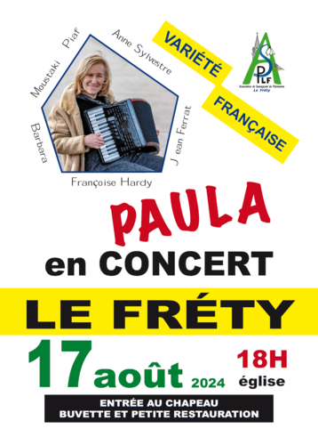 Accueil Agenda Concert Paula - Variété Française Partager : Concert Paula - Variété Française Le Fréty Église - Le Fréty samedi 17 août 2024 à partir de 18:00 jusqu'à 19:00 . Entrée au chapeau Buvette et petite restauration Contact : , 08290 Le Fréty