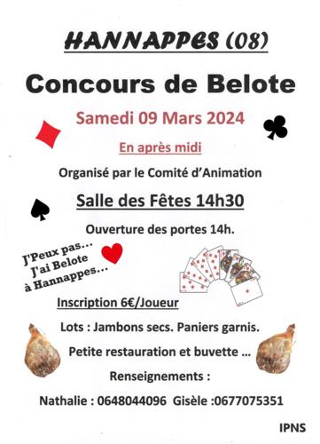 Accueil Agenda Concours de Belote Partager : Concours de Belote Hannappes Hannappes samedi 09 mars 2024 à partir de 14:00 jusqu'à 17:30 . Contact : 08290 Hannappes Nathalie: 06 48 04 40 96 Gisèle: 06 77 07 53 51 Itinéraire