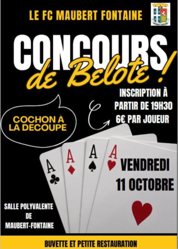 Accueil Agenda Concours de Belote Partager : Concours de Belote Maubert-Fontaine Salle polyvalente de Maubert-Fontaine vendredi 11 octobre 2024 à partir de 19:30 jusqu'à 23:00 . 6€ par joueur Buvette et petite restauration Contact : Le FC Maubert-Fontaine , 08260 Maubert-Fontaine