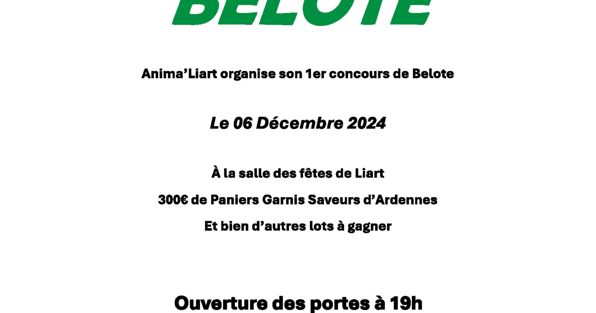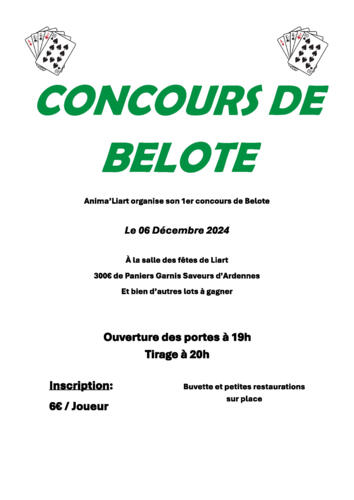 Accueil Agenda Concours de Belote Partager : Concours de Belote Liart salle des fêtes de Liart vendredi 06 décembre 2024 à partir de 19:00 jusqu'à 22:30 . Tirage 20hInscription: 6€ par joueur 300€ de Paniers Garnis saveurs d’Ardennes et d’autres lots à gagner.Buvette et petites restaurations sur place. Contact : Anima'Liart , 08290 Liart