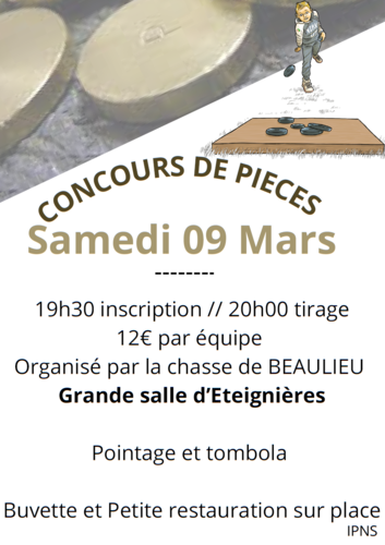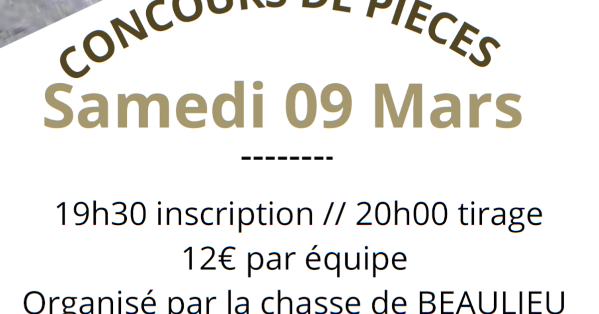 Accueil Agenda Concours de Pièces Partager : Concours de Pièces Éteignières Grande salle d'Éteignières samedi 09 mars 2024 à partir de 19:30 jusqu'à 23:00 . Contact : 08260 Éteignières Itinéraire