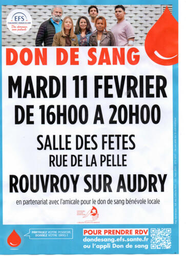 Accueil Agenda Don de sang Partager : Don de sang Rouvroy-Sur-Audry Salle des fêtes, rue de la pelle mardi 11 février 2025 à partir de 16:00 jusqu'à 20:00 . Contact : , 08150 Rouvroy-Sur-Audry
