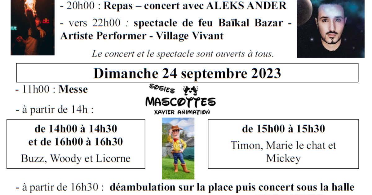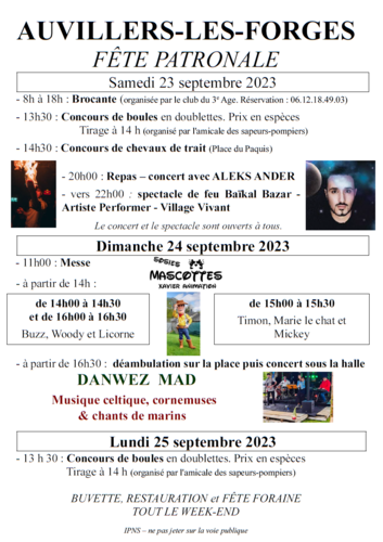 Accueil Agenda Fête Patronale AUVILLERS-LES-FORGES Partager : Fête Patronale AUVILLERS-LES-FORGES Auvillers-Les-Forges Auvillers-Les-Forges samedi 23 septembre 2023 à partir de 08:00 jusqu'au lundi 25 septembre à 18:00 . Contact : 08260 Auvillers-Les-Forges Itinéraire
