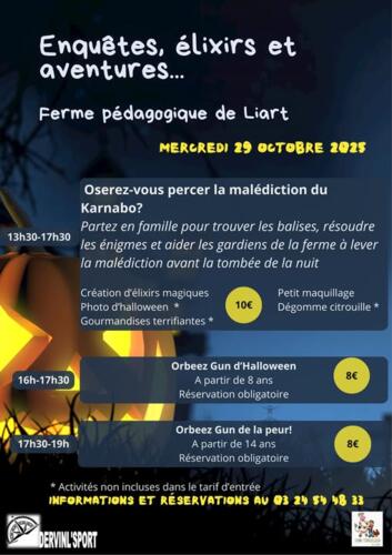 Accueil Agenda Halloween à Liart Partager : Halloween à Liart Liart - Ferme pédagogique mercredi 29 octobre 2025 à partir de 13:30 jusqu'à 19:00 . Contact : Maison de la Thiérache , 03 24 54 48 33 Itinéraire