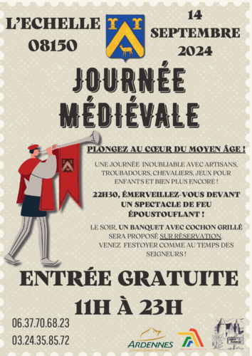 Accueil Agenda Journée Médiévale Partager : Journée Médiévale L'Échelle samedi 14 septembre 2024 à partir de 11:00 jusqu'à 23:00 . Contact : , 08150 L'Échelle 03 24 35 85 72 / 06 37 70 68 23