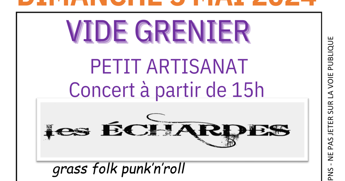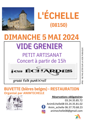 L’as­so­cia­tion Anim’E­chelle orga­nise un marché arti­sa­nal – vide-greniers le dimanche 5 mai 2024. Sur place : buvette, petite restau­ra­tion, expo­sants dans le château, musée de l’école. Réser­va­tions par mail : anime­chel­le08@g­mail.com ou par télé­phone au 06.37.70.68.23 ou 03.24.35.85.72.