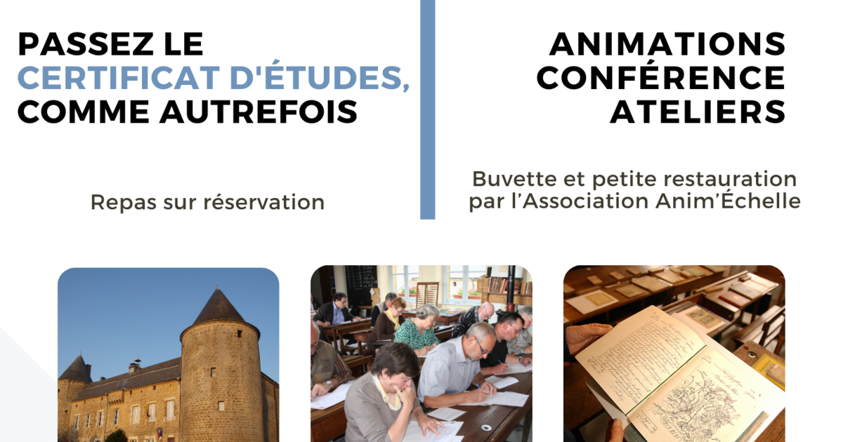 Accueil Agenda Passez le certificat d'études comme autrefois Partager : Passez le certificat d'études comme autrefois L'Échelle Château de L'Échelle samedi 08 juin 2024 à partir de 08:30 jusqu'à 12:30 . Contact : 08150 L'Échelle 03 24 33 02 99 musecoledhier@orange.fr Itinéraire