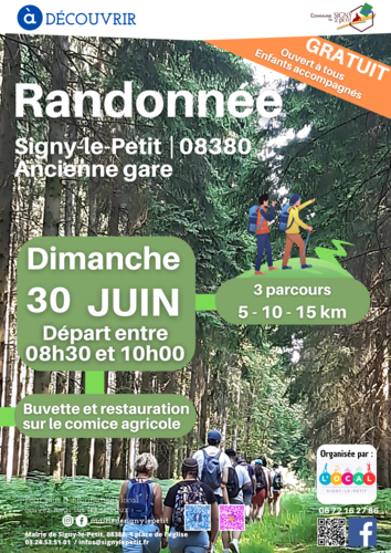 Accueil Agenda Randonnée Partager : Randonnée Signy-Le-Petit Ancienne gare dimanche 30 juin 2024 à partir de 08:30 jusqu'à 12:00 . Départ entre 08h30 et 10h003 parcours : 5 – 10 – 15km Contact : L'Ocal Signy-Le-Petit , 08380 Signy-Le-Petit 06 72 16 27 86