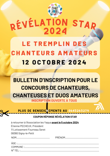 Accueil Agenda Révélation star 2024 - Le tremplin des chanteurs amateurs Partager : Révélation star 2024 - Le tremplin des chanteurs amateurs Signy-Le-Petit Signy-Le-Petit samedi 12 octobre 2024 à partir de 13:00 jusqu'à 18:00 . Inscription Ouverte à tous. Contact : , 08380 Signy-Le-Petit 06 45 26 52 79 Itinéraire