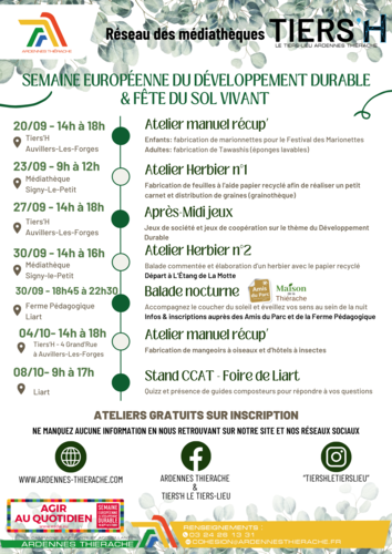Accueil Agenda Semaine Européenne du Développement Durable et Fête du Sol Vivant Partager : Semaine Européenne du Développement Durable et Fête du Sol Vivant mercredi 20 septembre 2023 à partir de 14:00 jusqu'au dimanche 08 octobre à 18:00 . GRATUIT – OUVERT A TOUS Contact :