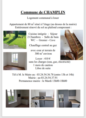 Appartement de 80 m2 situé à l’étage (au dessus de la mairie) Entièrement rénové du sol au plafond comprenant :