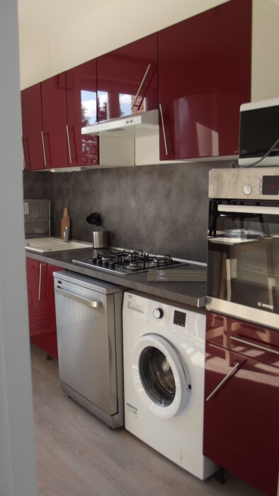 L’appartement est meublé comprenant l’équipement : télévision, frigo, four, machine à laver, lave-vaisselle, micro-onde, vaisselles.